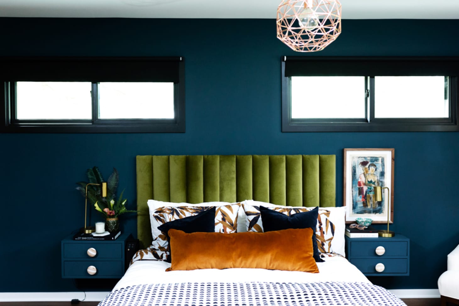 Heidi caillier opted for a deep green ish navy hue to marry the green brown and blue tones throughout the bedroom. One blogger shows us how to use navy paint bedding accents and more. To get the look shop owner laura jayson mixed flea market finds with luxe sferra linens.